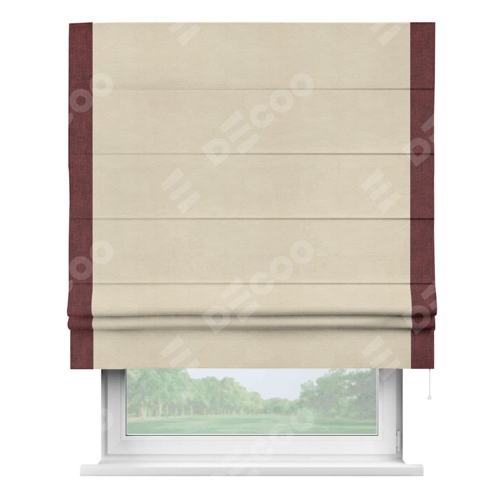 Римская штора производителя «Cortin», используется для проёма, пошита из ткани лён кашемир шампань, артикул 17205. Отделка шторы кантом «Стрим Дуо», ткань для канта используется из льна разной расцветки на выбор. Имеет универсальный механизм и подходит для монтажа: на потолок, на стену и в нишу.