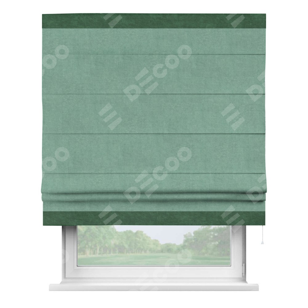 Римская штора производителя «Cortin», используется для проёма, пошита из ткани канвас мятный, артикул ткани v-248. Отделка шторы кантом «Горизонт» (тёмно-зелёный v-469), ткань для канта используется из канваса разной расцветки на выбор. Имеет универсальный механизм и подходит для монтажа: на потолок, на стену и в нишу.