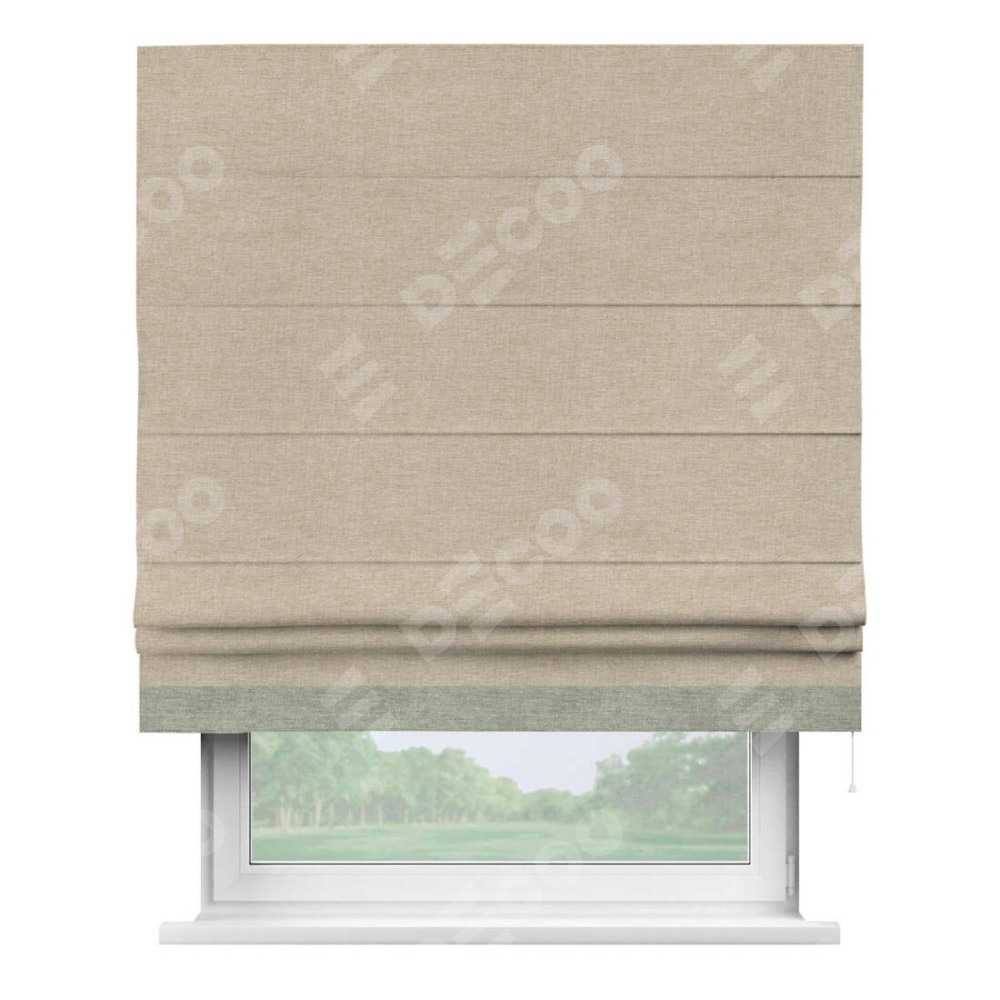 Римская штора производителя «Cortin», используется для проёма, пошита из ткани лён кашемир бежевый, артикул 17206. Отделка шторы кантом «Джестер», ткань для канта используется из льна разной расцветки на выбор. Имеет универсальный механизм и подходит для монтажа: на потолок, на стену и в нишу.