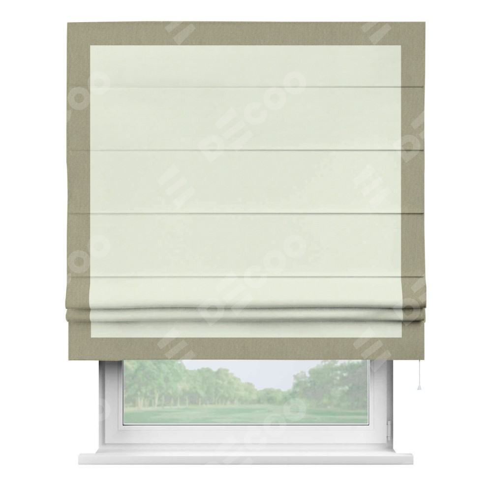 Римская штора производителя «Cortin», используется для проёма, пошита из ткани канвас сливочный, артикул ткани v-94. Отделка шторы кантом «Чесс» (латте v-12490), ткань для канта используется из канваса разной расцветки на выбор. Имеет универсальный механизм и подходит для монтажа: на потолок, на стену и в нишу.