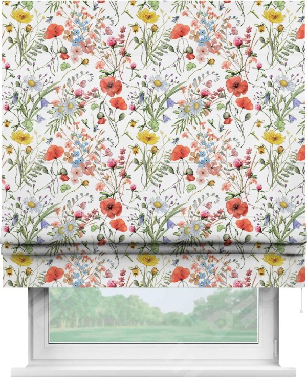 Классическая римская штора производителя «Cortin», пошита из ткани блэкаут с нанесением сублимационной печати «Полевые маки». Имеет универсальный механизм и подходит для монтажа: на потолок, на стену и в нишу.