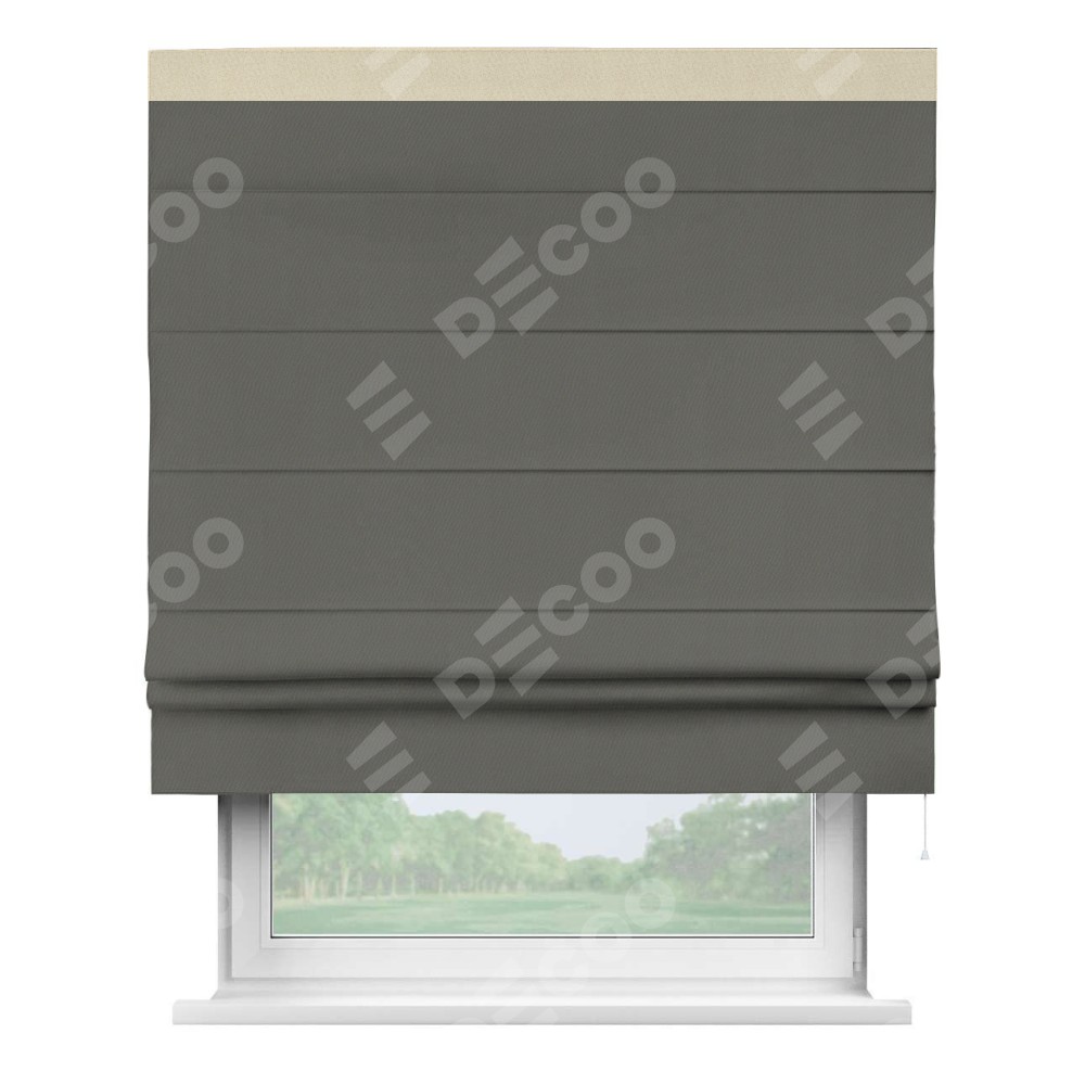 Римская штора производителя «Cortin», используется для проёма, пошита из ткани блэкаут однотонный тёмно-серый, артикул ткани 91570. Отделка шторы кантом «Кинг», ткань для канта используется из блэкаута однотонного разной расцветки на выбор. Имеет универсальный механизм и подходит для монтажа: на потолок, на стену и в нишу.