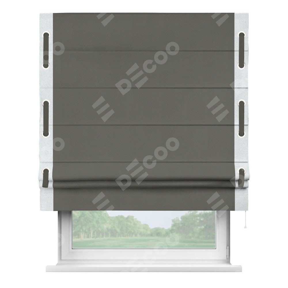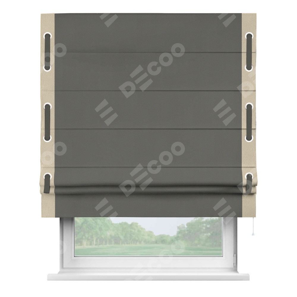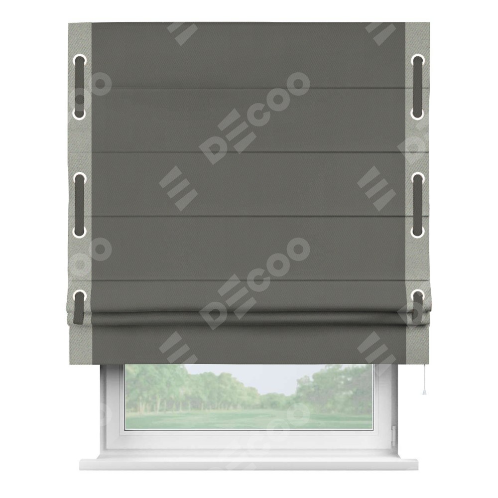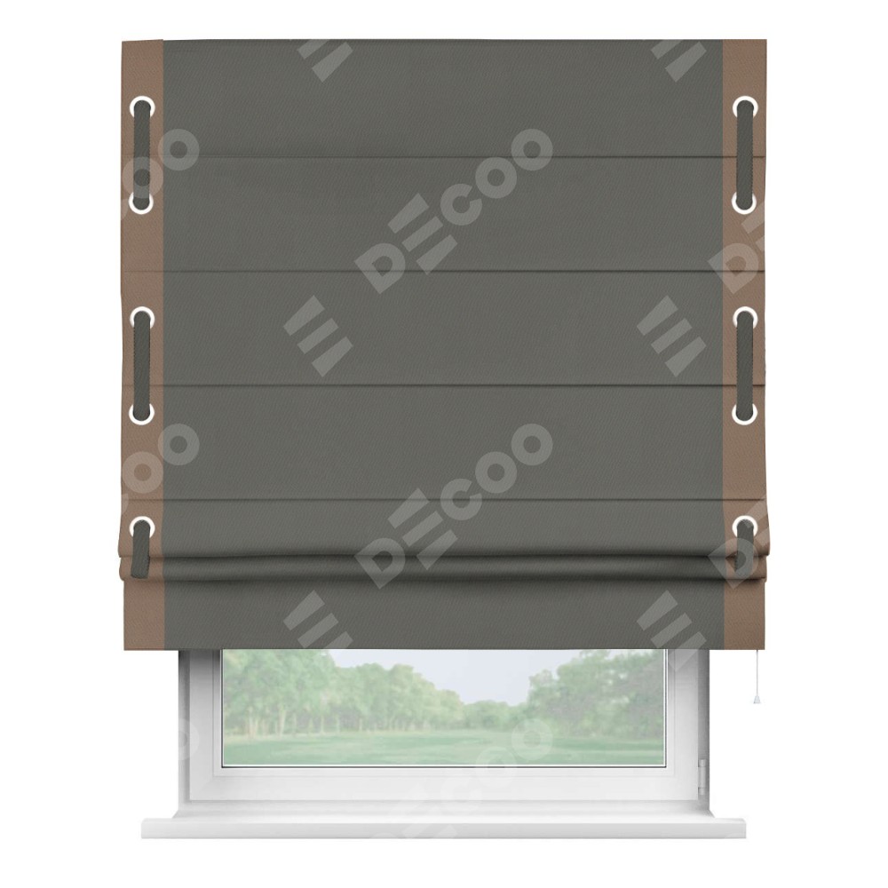 Римская штора «Кортин» для проема, блэкаут однотонный тёмно-серый с кантом Стрим Дуо (люверсы с пояском)