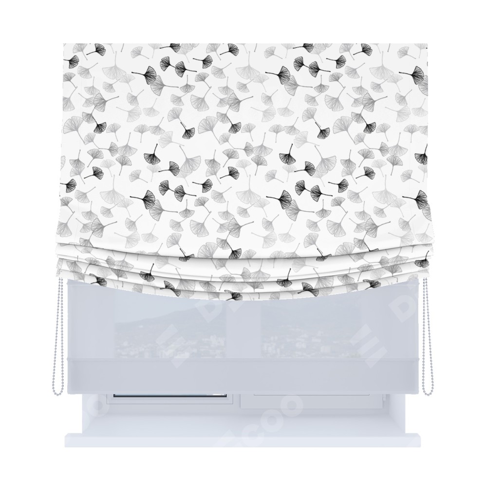 Римская штора день-ночь производителя «Cortin», используется для проёма, пошита из двух полотен, с лицевой блэкаут с нанесением сублимационной печати «Дымчатые листочки», вторая ткань тюль (по стандарту комплектуется тюль белого цвета артикул V-01). Имеет универсальный механизм и подходит для монтажа: на потолок, на стену и в нишу. Удобное управление каждой шторой отдельно.