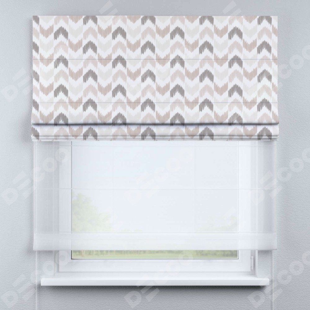 Двойная римская штора «День-ночь» от производителя Cortin предназначена для использования в проёмах. Эта штора уникальна тем, что состоит из двух полотен. На лицевой стороне находится блэкаут с нанесением сублимационной печати «Икат стрелки», обеспечивающий эффективное затемнение. В комплект также входит вторая ткань — легкий белый тюль (артикул: V-01), который добавляет изящества и легкости оформлению окна. Кроме того, доступны и другие разновидности ткани тюль, выбор которых доступен по ссылке .