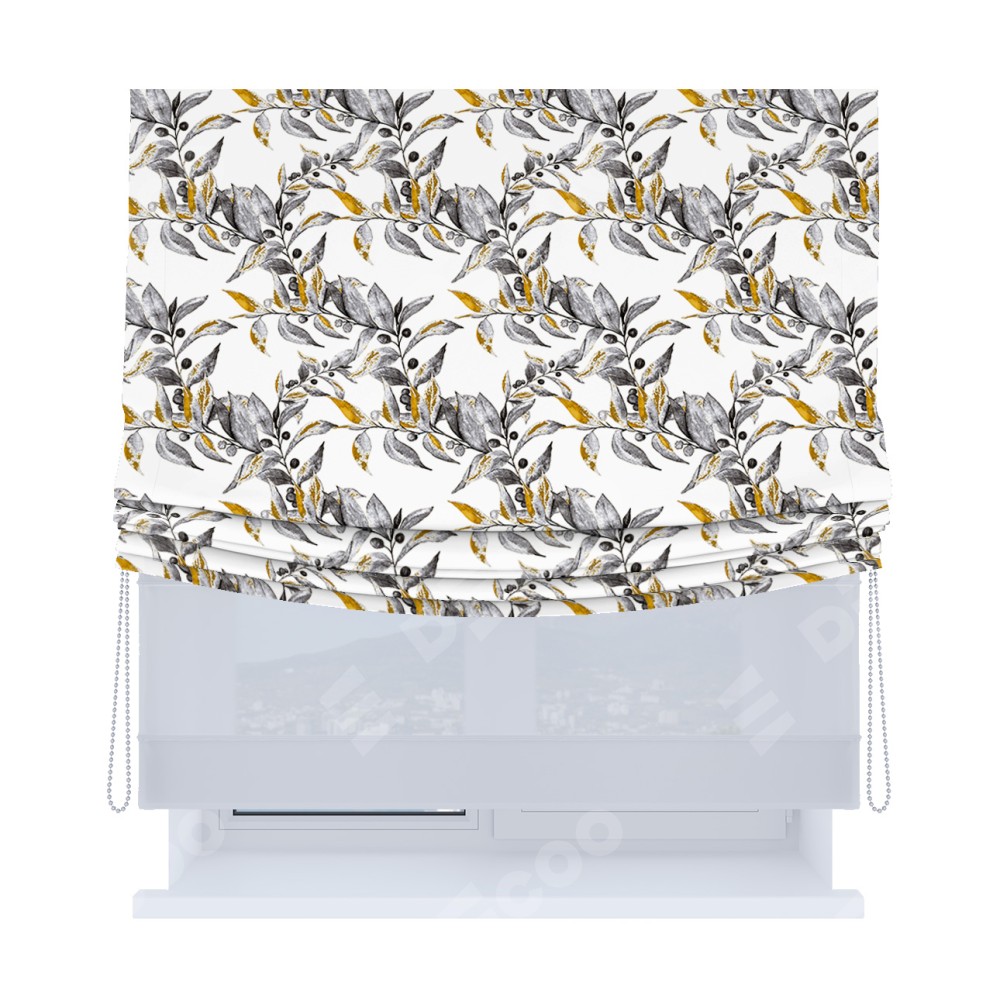 Римская штора день-ночь производителя «Cortin», используется для проёма, пошита из двух полотен, с лицевой блэкаут с нанесением сублимационной печати «Оливковое дерево», вторая ткань тюль (по стандарту комплектуется тюль белого цвета артикул V-01). Имеет универсальный механизм и подходит для монтажа: на потолок, на стену и в нишу. Удобное управление каждой шторой отдельно.