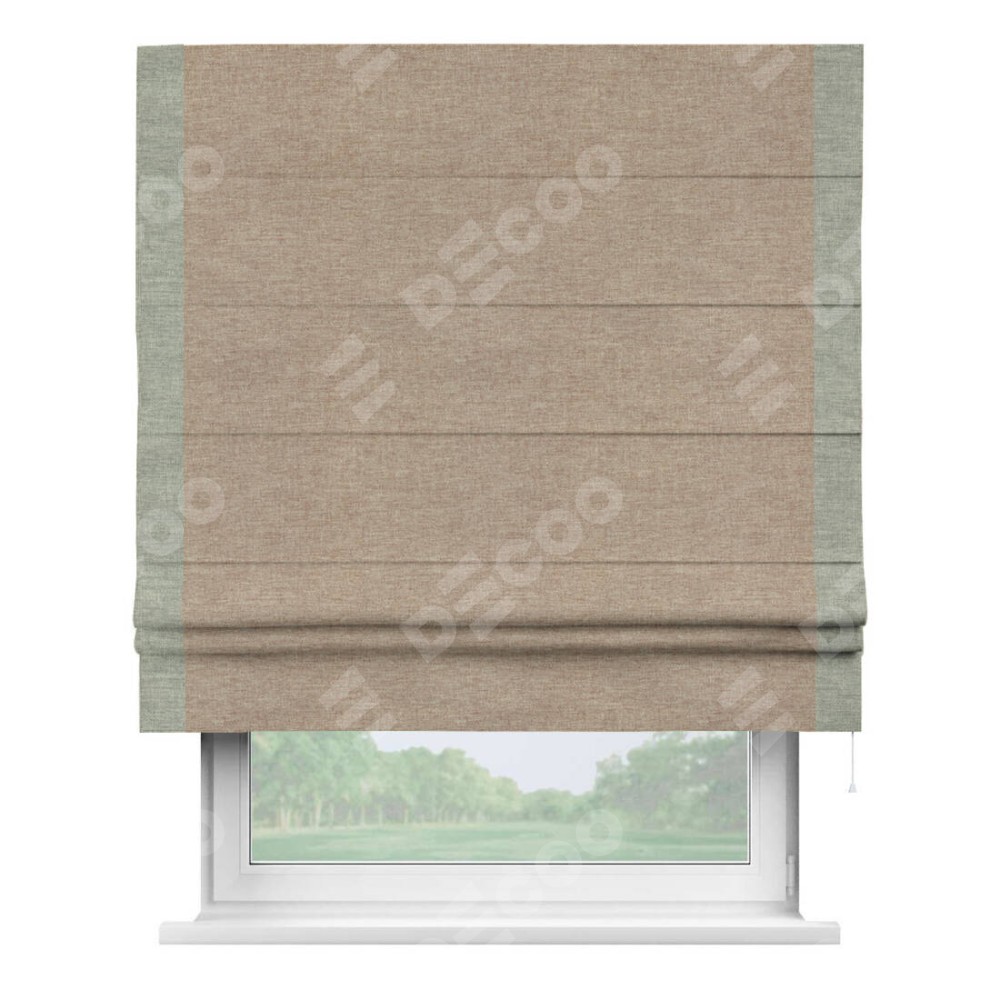 Римская штора производителя «Cortin», используется для проёма, пошита из ткани лён кашемир коричневый, артикул 21614. Отделка шторы кантом «Стрим Дуо», ткань для канта используется из льна разной расцветки на выбор. Имеет универсальный механизм и подходит для монтажа: на потолок, на стену и в нишу.