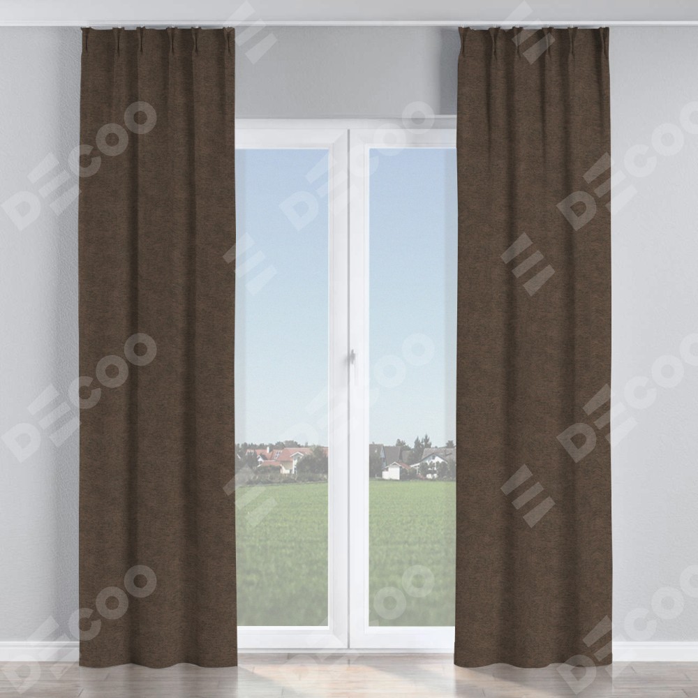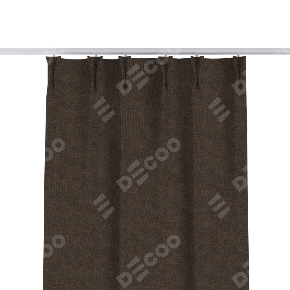 Комплект прямых штор, от производителя «Cortin», пошиты из ткани твид блэкаут тёмно-коричневый, артикул ткани 90933. С изнаночной стороны в верхней части штор пристрачивается шторная лента с декоративными складками «Кустик». Для создания элегантных складок прямые шторы шьются по стандарту с коэффициентом 1:2 (на 100 см. ширины проёма 200 см. ширины ткани).