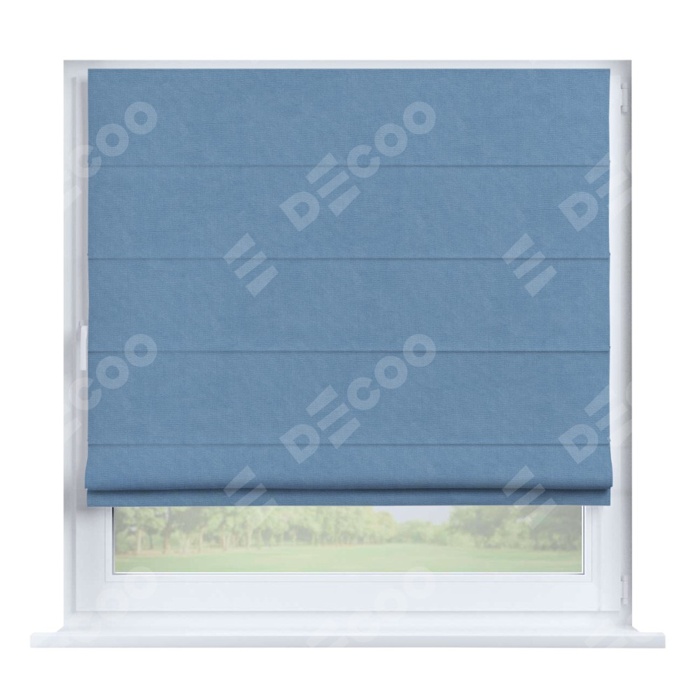 Римская штора производителя «Cortin», устанавливается на створку окна, пошита из ткани канвас голубой, артикул 92729. Штора шьётся по индивидуальным размерам, для данного типа римской шторы возможная ширина от 35 до 150 см., высота до 250 см.