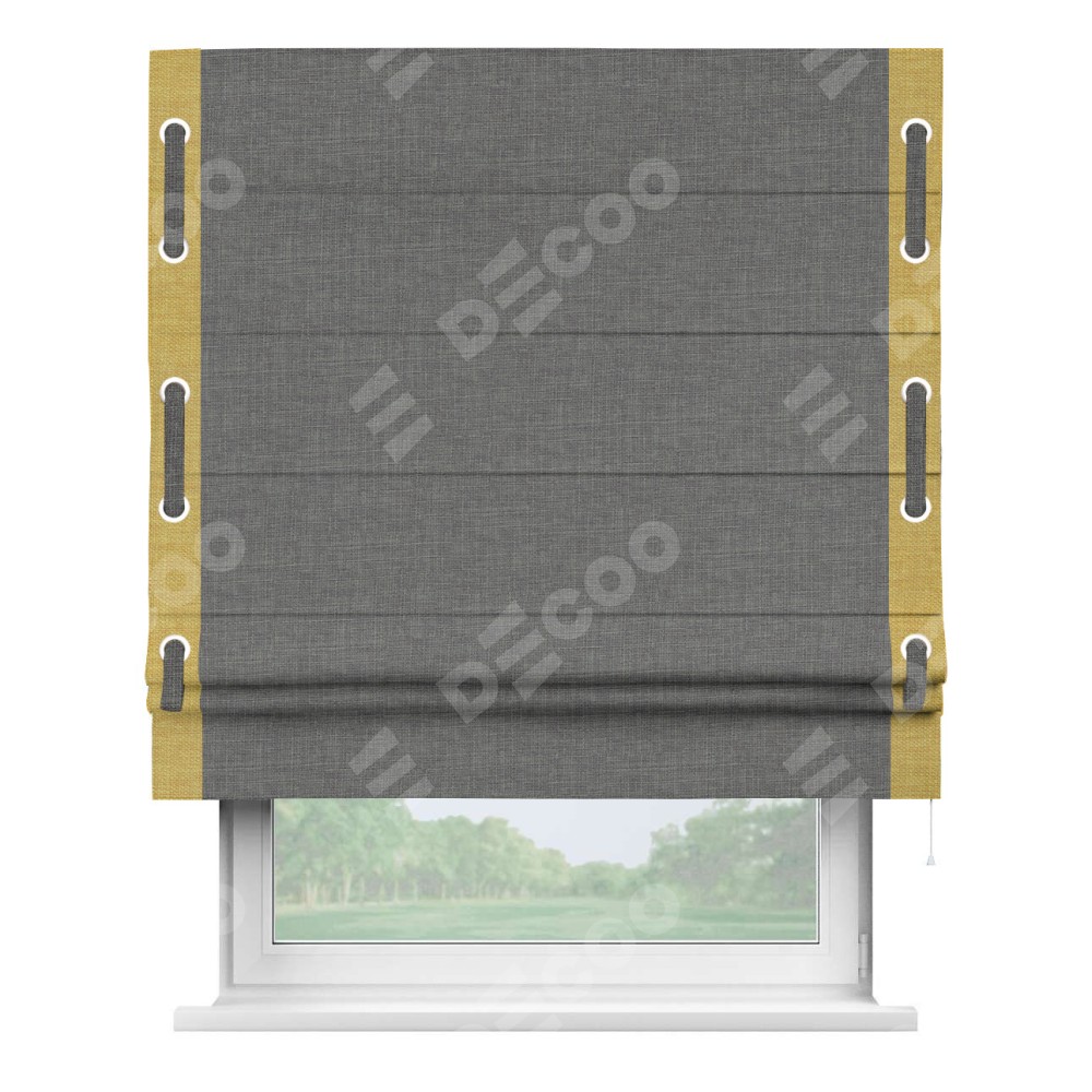 Римская штора производителя «Cortin», используется для проёма, пошита из ткани лён тёмно-серый, артикул 7441. Отделка шторы кантом «Стрим Дуо» на кантах расположены люверсы с пояском, ткань для канта используется из льна разной расцветки на выбор. Ткань для пояска обычно используется из основной ткани шторы, а так же можно сделать из любой расцветки по желанию. Имеет универсальный механизм и подходит для монтажа: на потолок, на стену и в нишу.