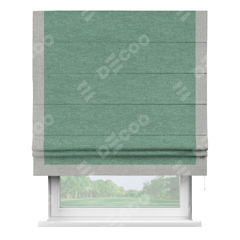 Римская штора производителя «Cortin», используется для проёма, пошита из ткани твид блэкаут бирюзовый, артикул 90934. Отделка шторы кантом «Виктория», ткань для канта используется из твида разной расцветки на выбор. Имеет универсальный механизм и подходит для монтажа: на потолок, на стену и в нишу.