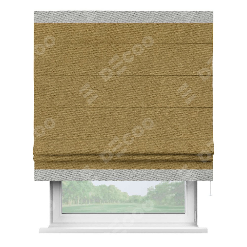 Римская штора производителя «Cortin», используется для проёма, пошита из ткани твид блэкаут горчица, артикул 91237. Отделка шторы кантом «Горизонт», ткань для канта используется из твида разной расцветки на выбор. Имеет универсальный механизм и подходит для монтажа: на потолок, на стену и в нишу.