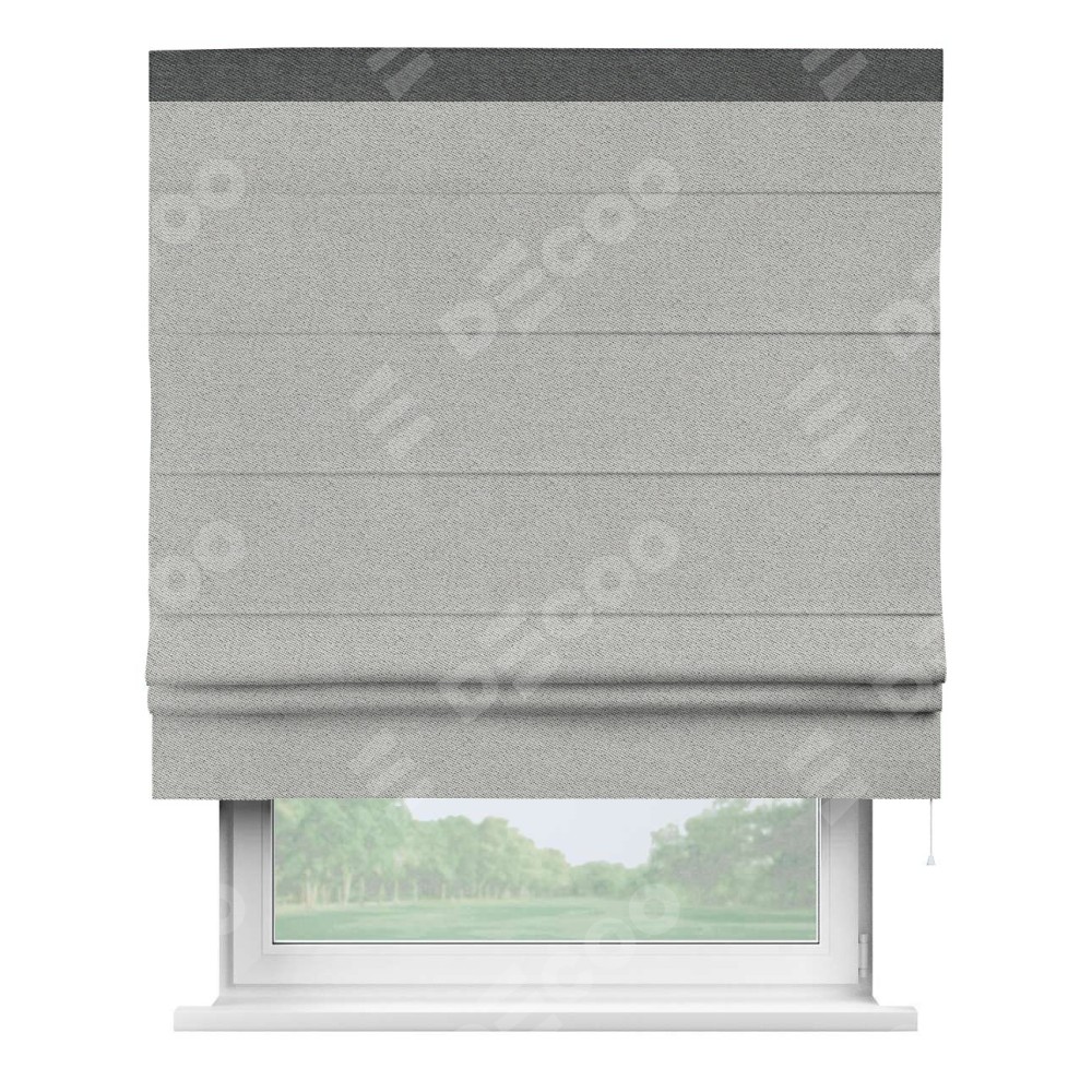 Римская штора производителя «Cortin», используется для проёма, пошита из ткани твид блэкаут светло-серый, артикул 90936. Отделка шторы кантом «Кинг», ткань для канта используется из твида разной расцветки на выбор. Имеет универсальный механизм и подходит для монтажа: на потолок, на стену и в нишу.