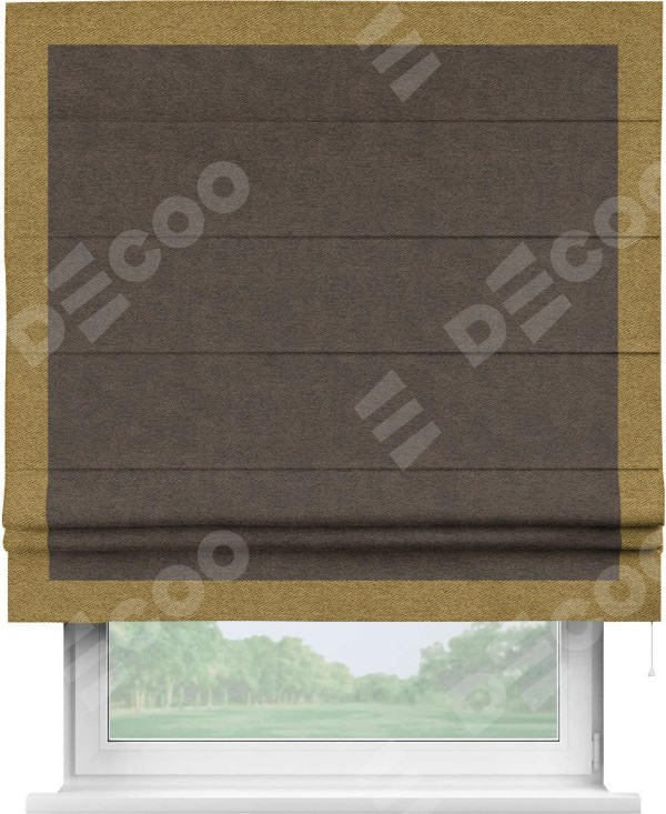 Римская штора производителя «Cortin», используется для проёма, пошита из ткани твид блэкаут тёмно-коричневый, артикул 90933. Отделка шторы кантом «Чесс», ткань для канта используется из твида разной расцветки на выбор. Имеет универсальный механизм и подходит для монтажа: на потолок, на стену и в нишу.