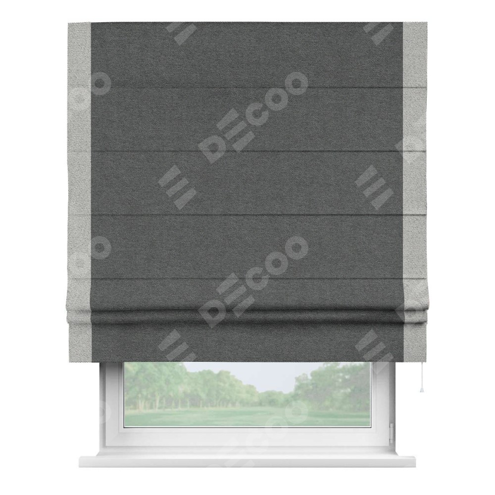 Римская штора производителя «Cortin», используется для проёма, пошита из ткани твид блэкаут тёмно-серый, артикул 90938. Отделка шторы кантом «Стрим Дуо», ткань для канта используется из твида разной расцветки на выбор. Имеет универсальный механизм и подходит для монтажа: на потолок, на стену и в нишу.