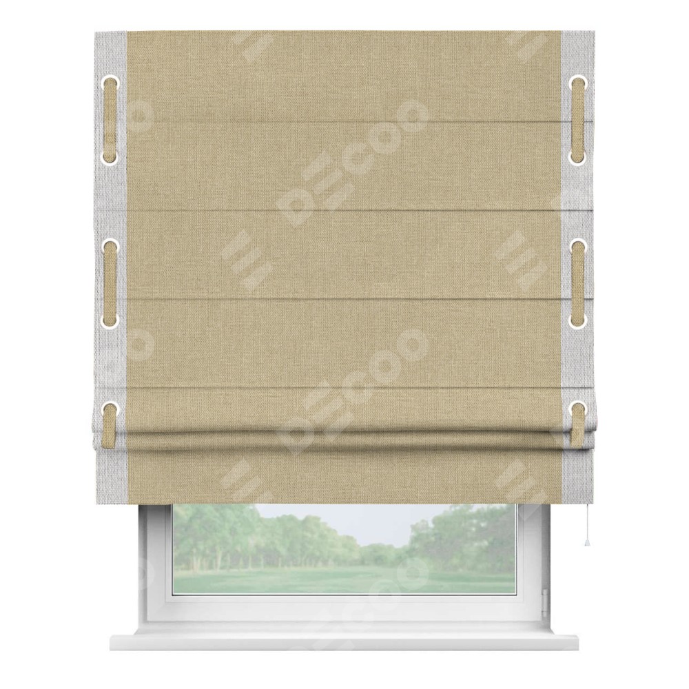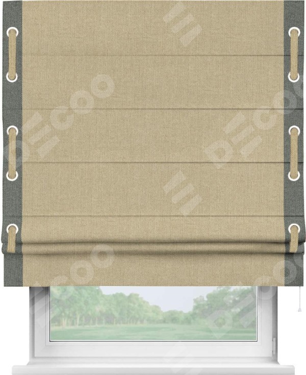 Римская штора «Кортин» для проема, лён димаут песочный с кантом Стрим Дуо (люверсы с пояском)