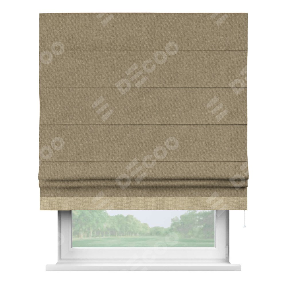 Римская штора пошита из ткани лён димаут тёмно-бежевый, артикул: 16261, с отделкой кантом «Джестер» выделяется своей уникальной особенностью — кантом, расположенным только снизу шторы. Этот дизайн добавляет оригинальности и игривости оконному оформлению, делая акцент на нижней части шторы и создавая интересный визуальный эффект. Отделка кантом на нижнем крае не только служит эстетической функции, но и способствует увеличению прочности и износостойкости ткани в этом месте.