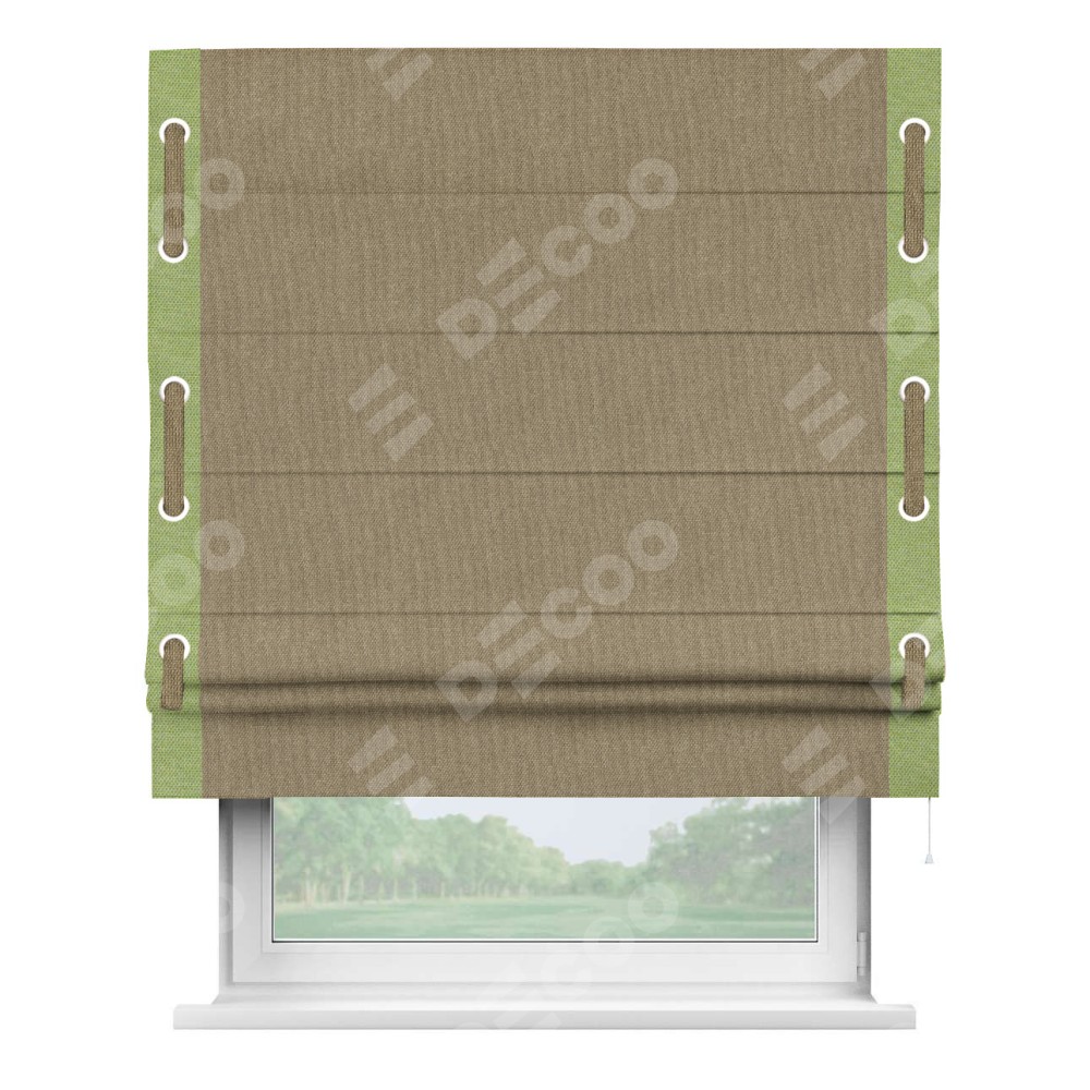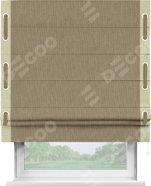 Римская штора пошита из ткани лён димаут тёмно-бежевый, артикул: 16261, с отделкой кантом «Стрим Дуо», дополненная декоративными люверсами на этих кантах и протянутым пояском из основного цвета римской шторы, представляет собой высоко декоративное и функциональное решение для оконного оформления. Канты, расположенные по обеим боковым сторонам шторы, уже добавляют изысканности и завершенности внешнему виду. Добавление люверсов и пояска не только усиливает декоративный эффект, но и придает шторе дополнительную текстурность и глубину.