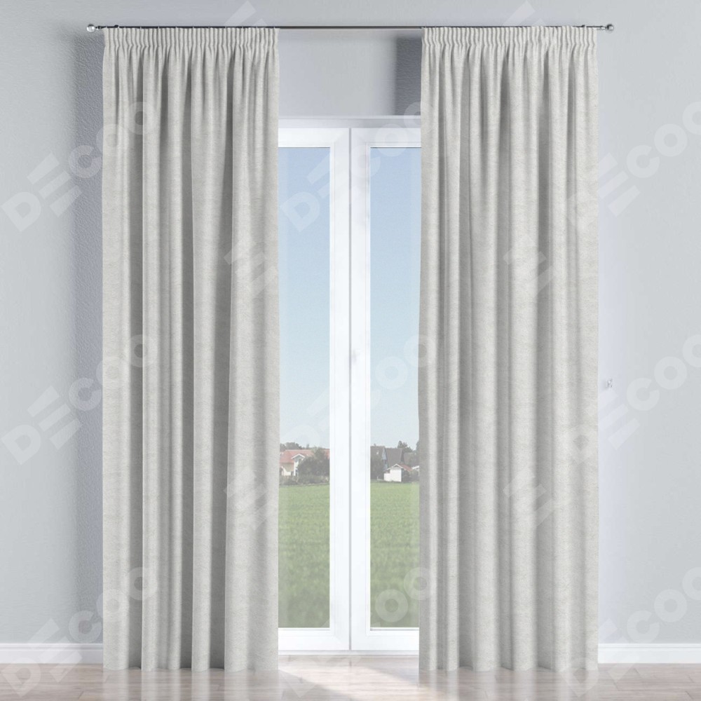 Комплект прямых штор, от производителя «Cortin», пошиты из ткани софт мрамор белый, артикул ткани 93581. С изнаночной стороны в верхней части штор пристрачивается шторная лента с декоративными складками «Карандаш». Для создания элегантных складок прямые шторы шьются по стандарту с коэффициентом 1:2 (на 100 см. ширины проёма 200 см. ширины ткани).