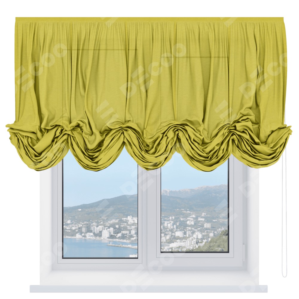 Австрийская штора производителя «Cortin», используется для проёма, пошита из ткани лён салатовый, артикул ткани 53437. Имеет универсальный механизм и подходит для монтажа: на потолок и на стену.