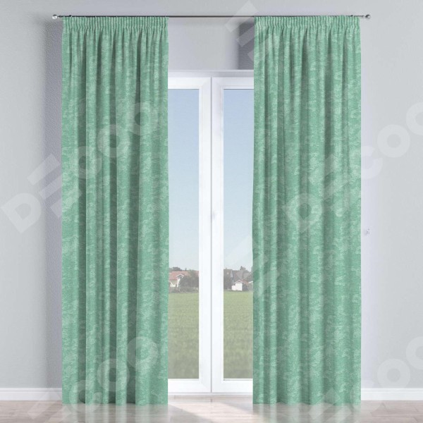 Комплект прямых штор, от производителя «Cortin», пошиты из ткани софт мрамор светло-зелёный, артикул ткани 93579. С изнаночной стороны в верхней части штор пристрачивается шторная лента с декоративными складками «Карандаш». Для создания элегантных складок прямые шторы шьются по стандарту с коэффициентом 1:2 (на 100 см. ширины проёма 200 см. ширины ткани).
