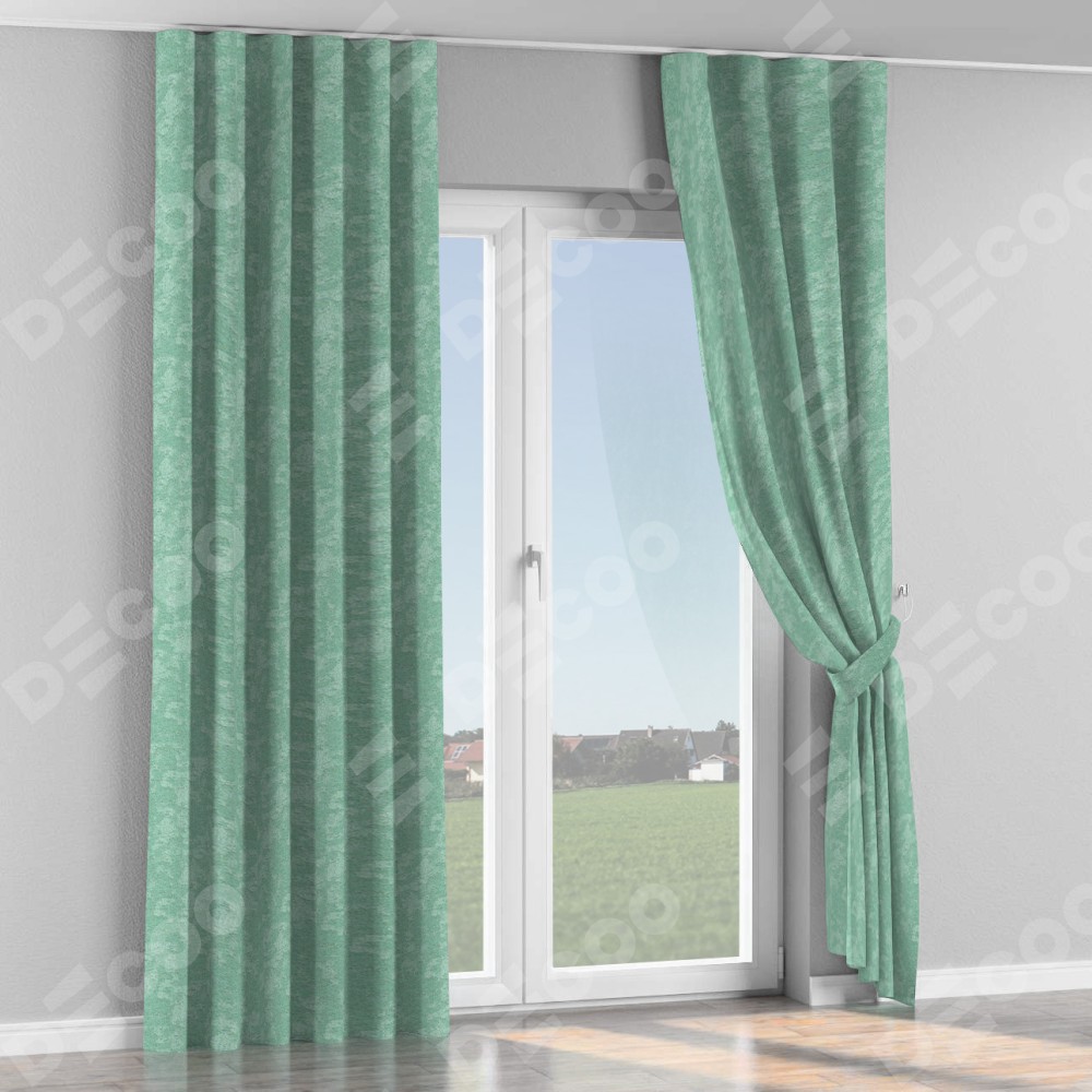 Комплект прямых штор, от производителя «Cortin», пошиты из ткани софт мрамор светло-зелёный, артикул ткани 93579. С изнаночной стороны в верхней части штор пристрачивается шторная лента с декоративными складками «Волна». Для создания элегантных складок прямые шторы шьются по стандарту с коэффициентом 1:2 (на 100 см. ширины проёма 200 см. ширины ткани).