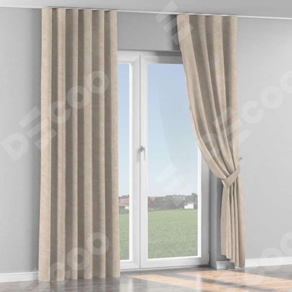 Комплект прямых штор, от производителя «Cortin», пошиты из ткани софт мрамор шампань, артикул ткани 93575. С изнаночной стороны в верхней части штор пристрачивается шторная лента с декоративными складками «Волна». Для создания элегантных складок прямые шторы шьются по стандарту с коэффициентом 1:2 (на 100 см. ширины проёма 200 см. ширины ткани).