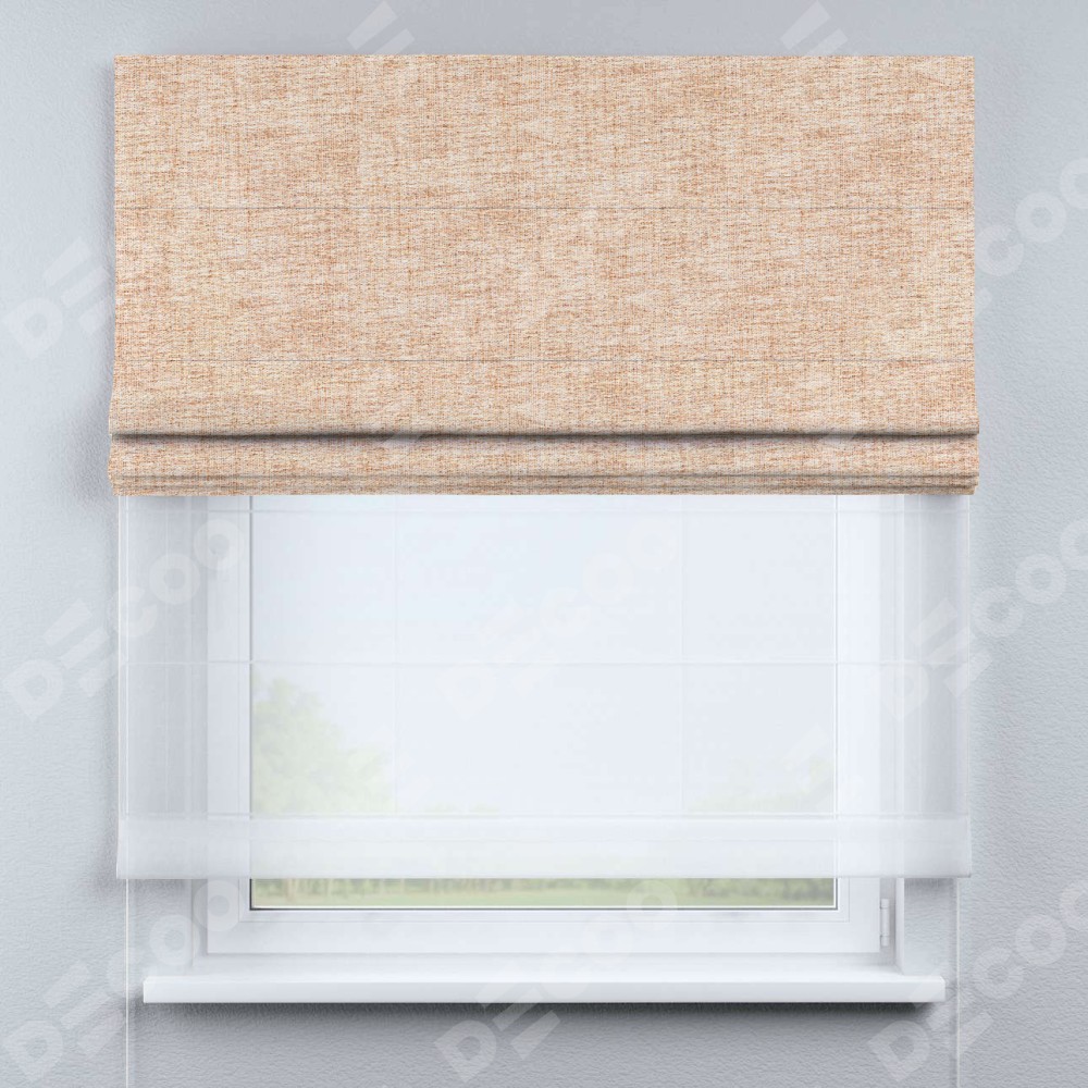 Двойная римская штора «День-ночь» от производителя Cortin предназначена для использования в проёмах. Эта штора уникальна тем, что состоит из двух полотен. На лицевой стороне находится рогожка димаут персиковый (артикул: 91016), обеспечивающая комфортное затемнение. В комплект также входит вторая ткань — легкий белый тюль (артикул: V-01), который добавляет изящества и легкости оформлению окна. Кроме того, доступны и другие разновидности ткани тюль, выбор которых доступен по ссылке .