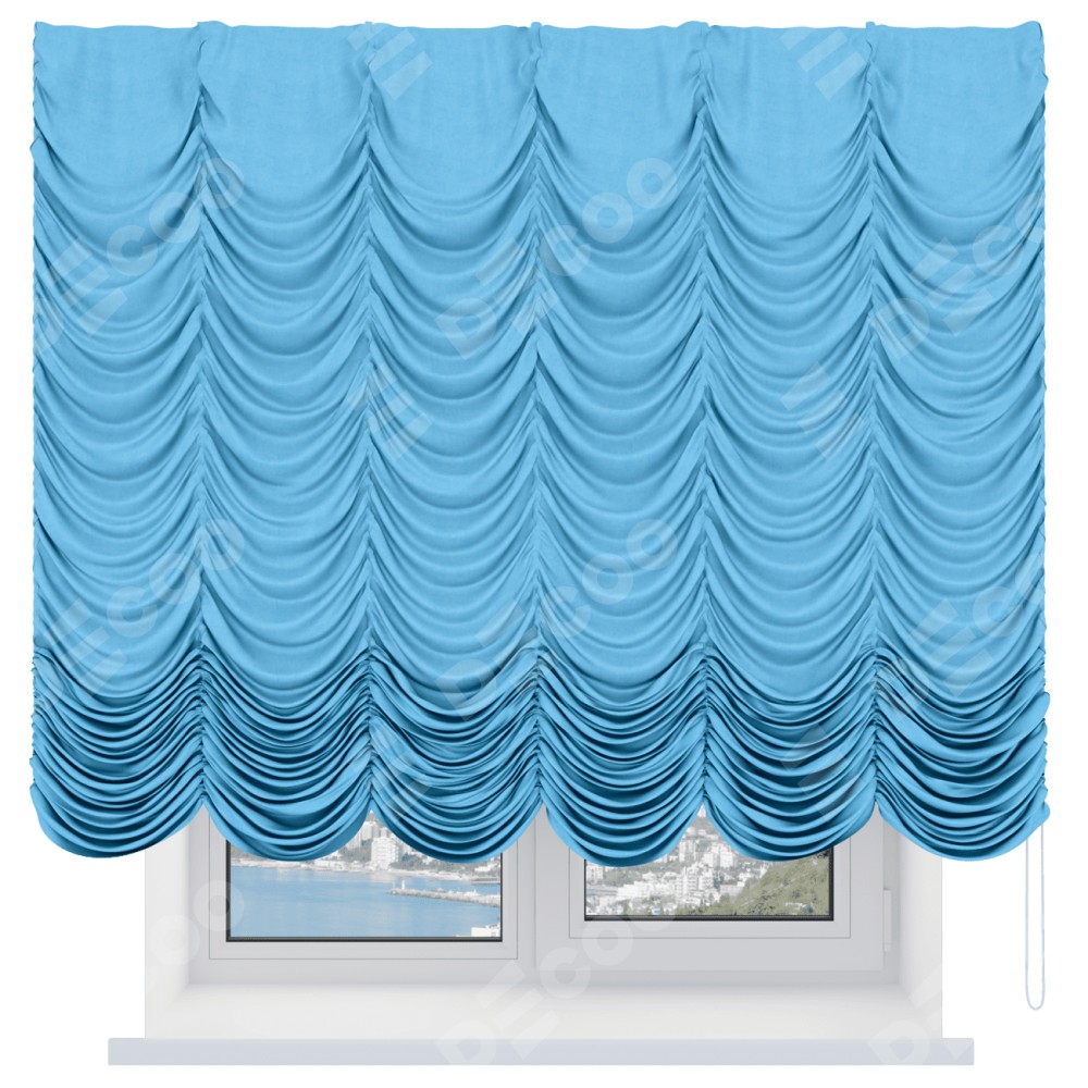 Французская штора производителя «Cortin», используется для проёма, пошита из ткани вельвет голубой, артикул ткани 85544. Имеет универсальный механизм и подходит для монтажа: на потолок и на стену.