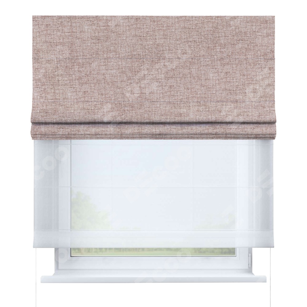Двойная римская штора «День-ночь» от производителя Cortin предназначена для использования в проёмах. Эта штора уникальна тем, что состоит из двух полотен. На лицевой стороне находится рогожка димаут пыльный розовый (артикул: 91019), обеспечивающий эффективное затемнение. В комплект также входит вторая ткань — легкий белый тюль (артикул: V-01), который добавляет изящества и легкости оформлению окна. Кроме того, доступны и другие разновидности ткани тюль, выбор которых доступен по  ссылке .