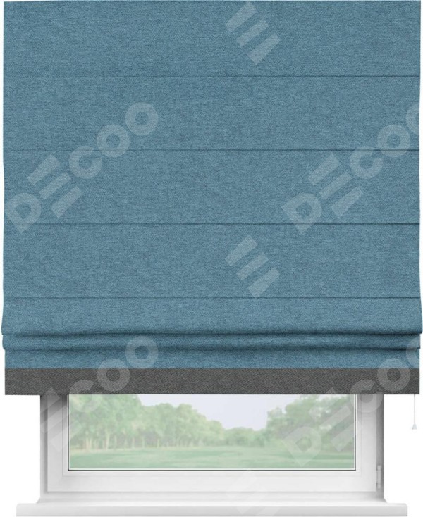 Римская штора пошита из ткани твид блэкаут светло-синий, артикул: 90935, с отделкой кантом «Джестер» выделяется своей уникальной особенностью — кантом, расположенным только снизу шторы. Этот дизайн добавляет оригинальности и игривости оконному оформлению, делая акцент на нижней части шторы и создавая интересный визуальный эффект. Отделка кантом на нижнем крае не только служит эстетической функции, но и способствует увеличению прочности и износостойкости ткани в этом месте.