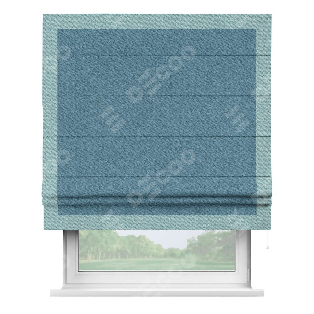 Римская штора пошита из ткани твид блэкаут светло-синий, артикул: 90935, с отделкой кантом «Чесс» отличается своей уникальной деталью — наличием канта не только по бокам и снизу, но и сверху по всем краям шторы. Это придает шторе особенно аккуратный и завершенный вид, делая акцент на границах и форме шторы. Отделка кантом по всему периметру шторы усиливает её декоративные качества и подчеркивает строгую геометрию, что может быть особенно актуально для современных и минималистичных интерьеров.
