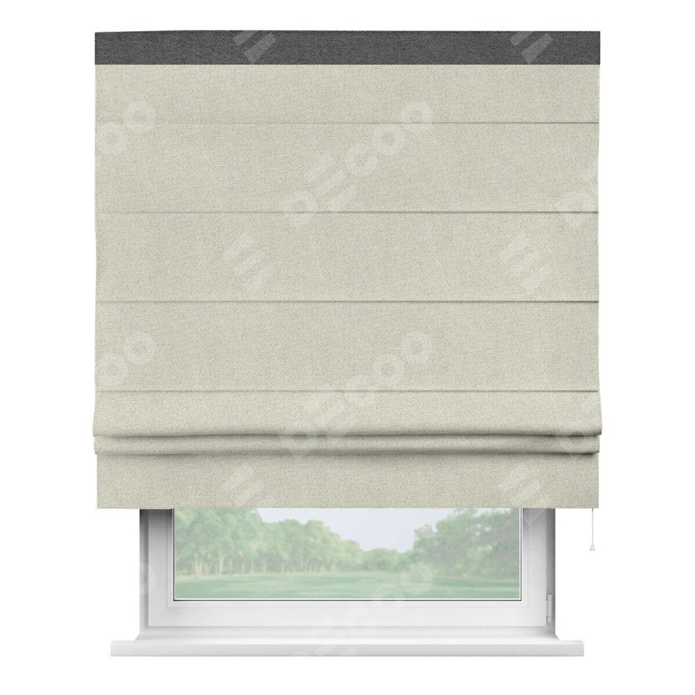 Римская штора пошита из ткани твид блэкаут шампань, артикул: 90929, с отделкой кантом «Кинг» отличается своей необычной особенностью: кант располагается исключительно сверху шторы. Такой дизайн делает акцент на верхней части окна, визуально поднимая потолок и придавая интерьеру более возвышенный и изысканный вид. Отделка кантом на верхней кромке не только украшает штору, но и может служить дополнительной защитой от износа в месте наибольшего контакта с механизмом управления шторой.
