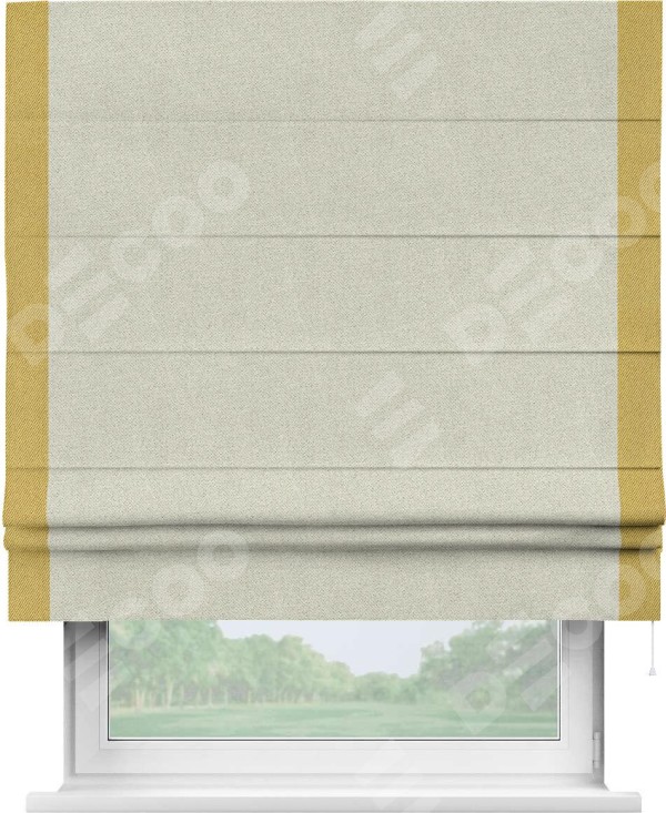 Римская штора пошита из ткани твид блэкаут шампань, артикул: 90929, с отделкой кантом «Стрим Дуо» выделяется наличием кантов по обоим бокам шторы, слева и справа. Этот дизайн придает шторе аккуратный и завершенный вид, акцентируя вертикальные линии и визуально вытягивая окно в высоту. Отделка кантом по бокам не только украшает штору, но и служит практической функцией, укрепляя края и продлевая срок службы изделия.