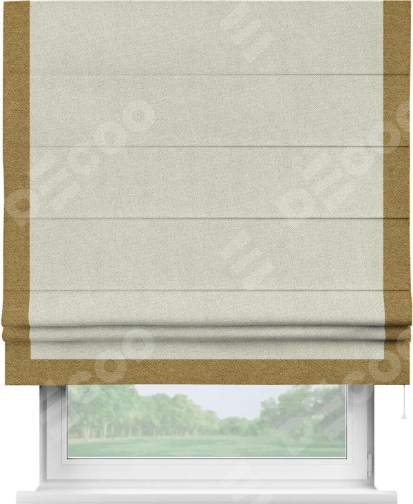 Римская штора с отделкой кантом «Виктория», пошита из ткани твид блэкаут шампань, артикул: 90929. представляет собой элегантное решение для оконного оформления. Кант по бокам и снизу шторы добавляет изысканности и аккуратности внешнему виду, подчеркивая линии и форму шторы. Этот элемент декора не только украшает, но и выполняет практическую функцию, защищая края ткани от износа. Кант может быть выполнен в контрастном или гармонирующем цвете, что позволяет добиться различных стилевых эффектов и легко вписать штору в интерьер комнаты.
