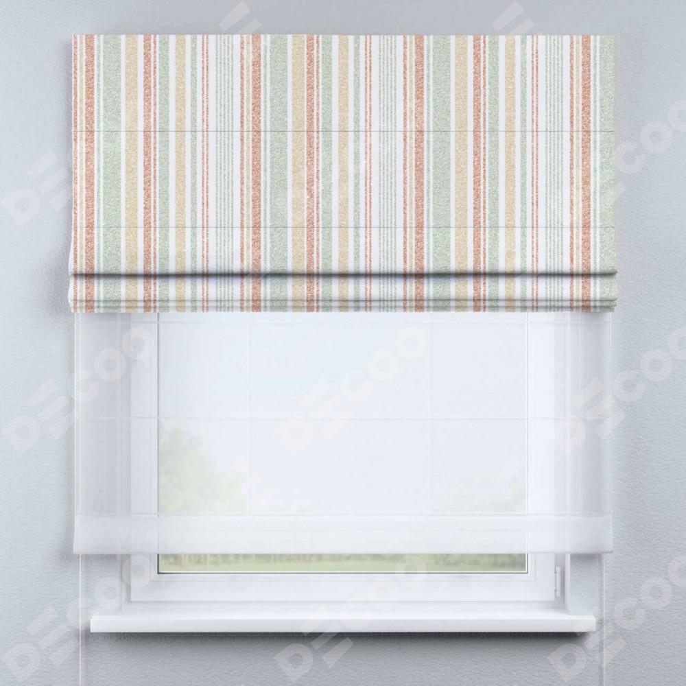 Есть модель римских штор в которой первый слой из плотной ткани, защищающий от яркого солнечного света, а втрой слой из тюля. Тюль в такой модели штор дает легкость и прозрачность помещению. А также защищает от посторонних взглядов и рассеивает не яркий свет.