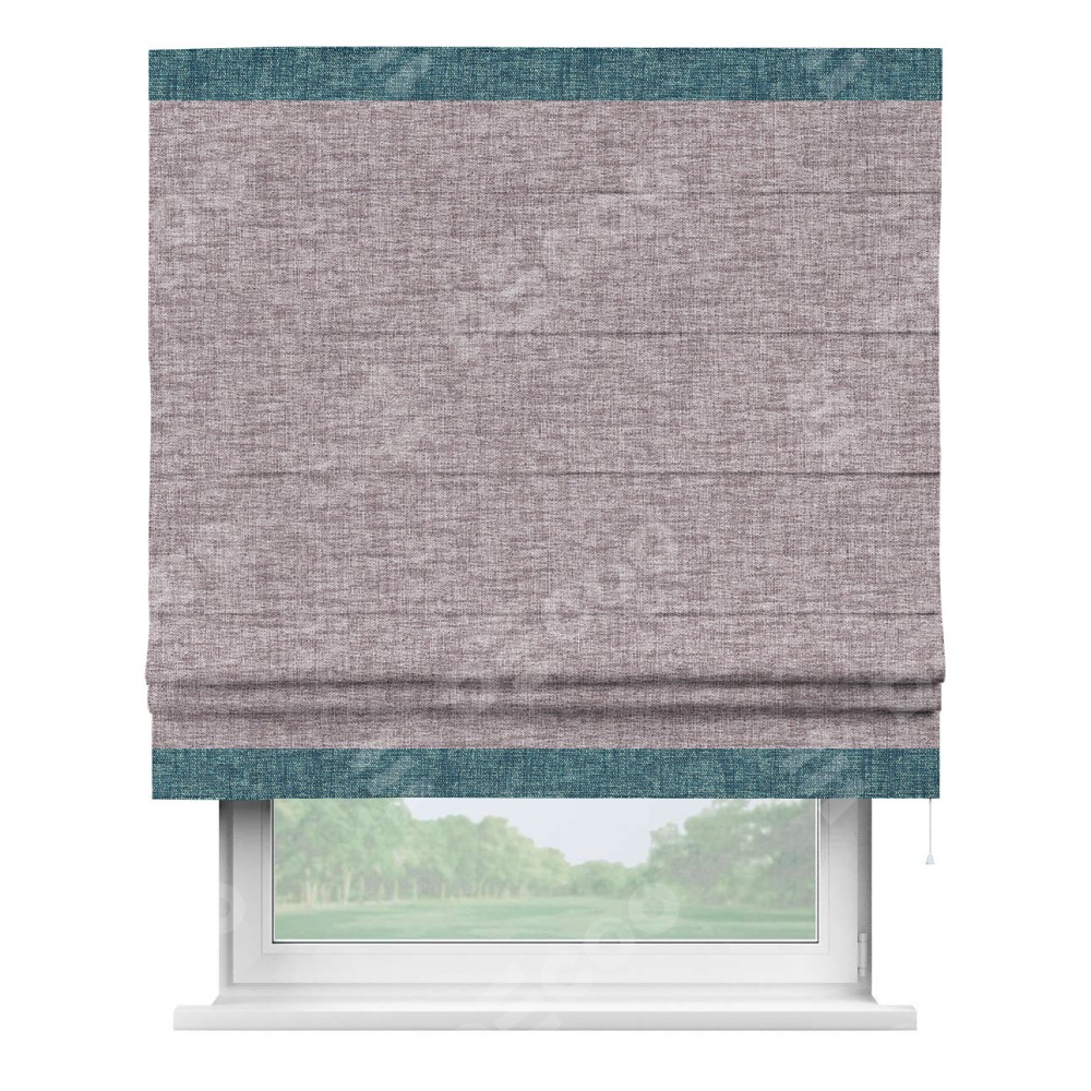 Римская штора пошита из ткани рогожка димаут розовый кварц, артикул: 91030, с отделкой кантом «Горизонт» предлагает уникальное дизайнерское решение, при котором кант располагается только вверху и снизу шторы. Такое решение делает акцент на горизонтальных линиях, визуально расширяя пространство и придавая окну более строгий и организованный вид. Отделка кантом в этих ключевых местах не только украшает штору, но и способствует её долговечности, защищая наиболее уязвимые к износу края.