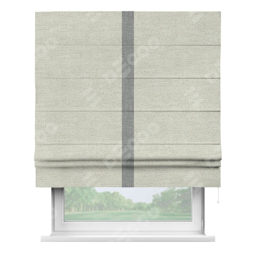 Римская штора пошита из ткани рогожка димаут серо-бежевый, артикул: 91014, с отделкой кантом «Хайвэй» представляет собой уникальное и смелое дизайнерское решение, где кант расположен вертикально посередине шторы. Этот дизайн не только выделяет штору среди других вариантов оформления окон, но и создает интересный визуальный акцент, привлекая внимание к центру окна и разделяя штору на визуальные зоны. Такой нестандартный подход добавляет динамичности интерьеру и может быть использован для подчеркивания особенностей оформления помещения.