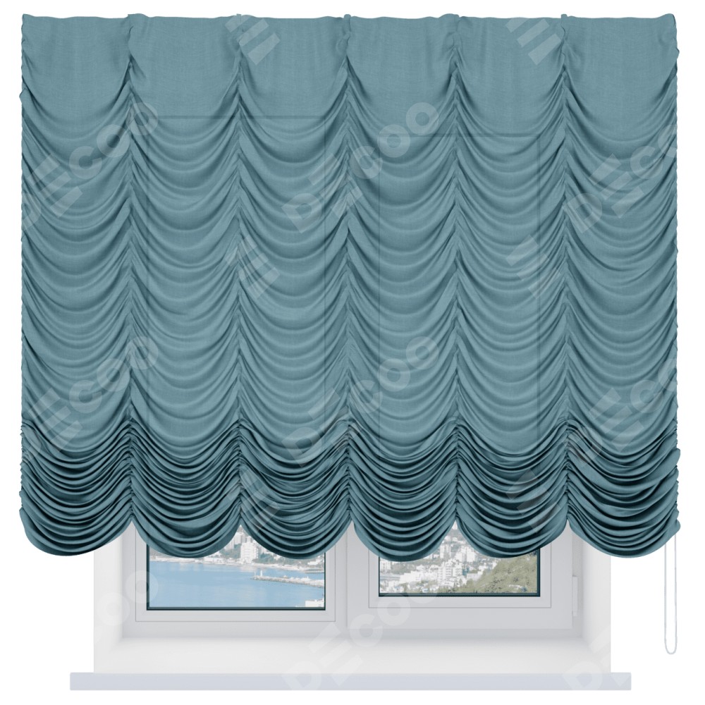 Французская штора производителя «Cortin», используется для проёма, пошита из ткани лён голубой, артикул ткани 74736. Имеет универсальный механизм и подходит для монтажа: на потолок и на стену.