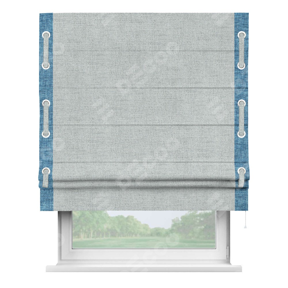 Римская штора пошита из ткани рогожка димаут серый, артикул: 91027, с отделкой кантом «Стрим Дуо», дополненная декоративными люверсами на этих кантах и протянутым пояском из основного цвета римской шторы, представляет собой высоко декоративное и функциональное решение для оконного оформления. Канты, расположенные по обеим боковым сторонам шторы, уже добавляют изысканности и завершенности внешнему виду. Добавление люверсов и пояска не только усиливает декоративный эффект, но и придает шторе дополнительную текстурность и глубину.