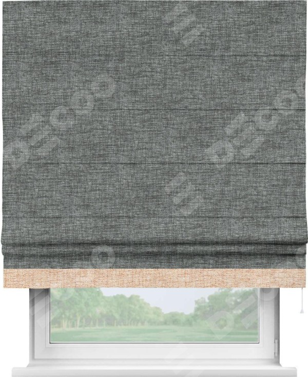 Римская штора пошита из ткани рогожка димаут тёмно-серый, артикул: 91029, с отделкой кантом «Джестер» выделяется своей уникальной особенностью — кантом, расположенным только снизу шторы. Этот дизайн добавляет оригинальности и игривости оконному оформлению, делая акцент на нижней части шторы и создавая интересный визуальный эффект. Отделка кантом на нижнем крае не только служит эстетической функции, но и способствует увеличению прочности и износостойкости ткани в этом месте.