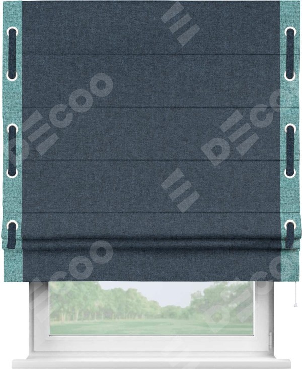 Римская штора «Кортин» для проёма, лён кашемир синий, с кантом Стрим Дуо (люверсы с пояском)