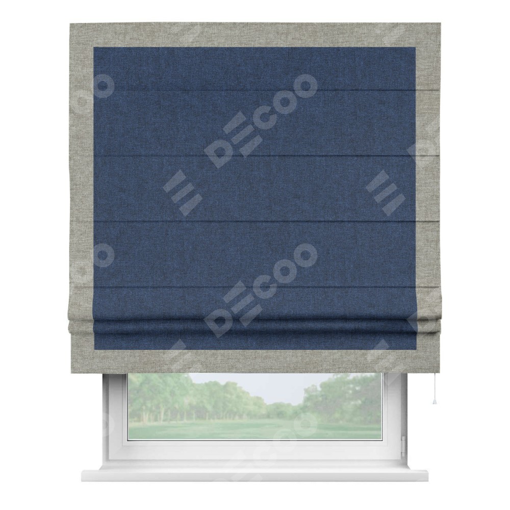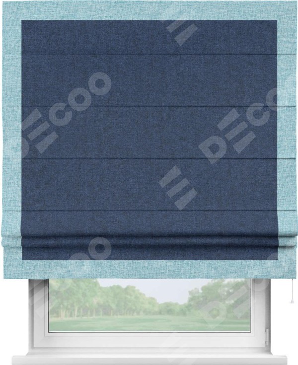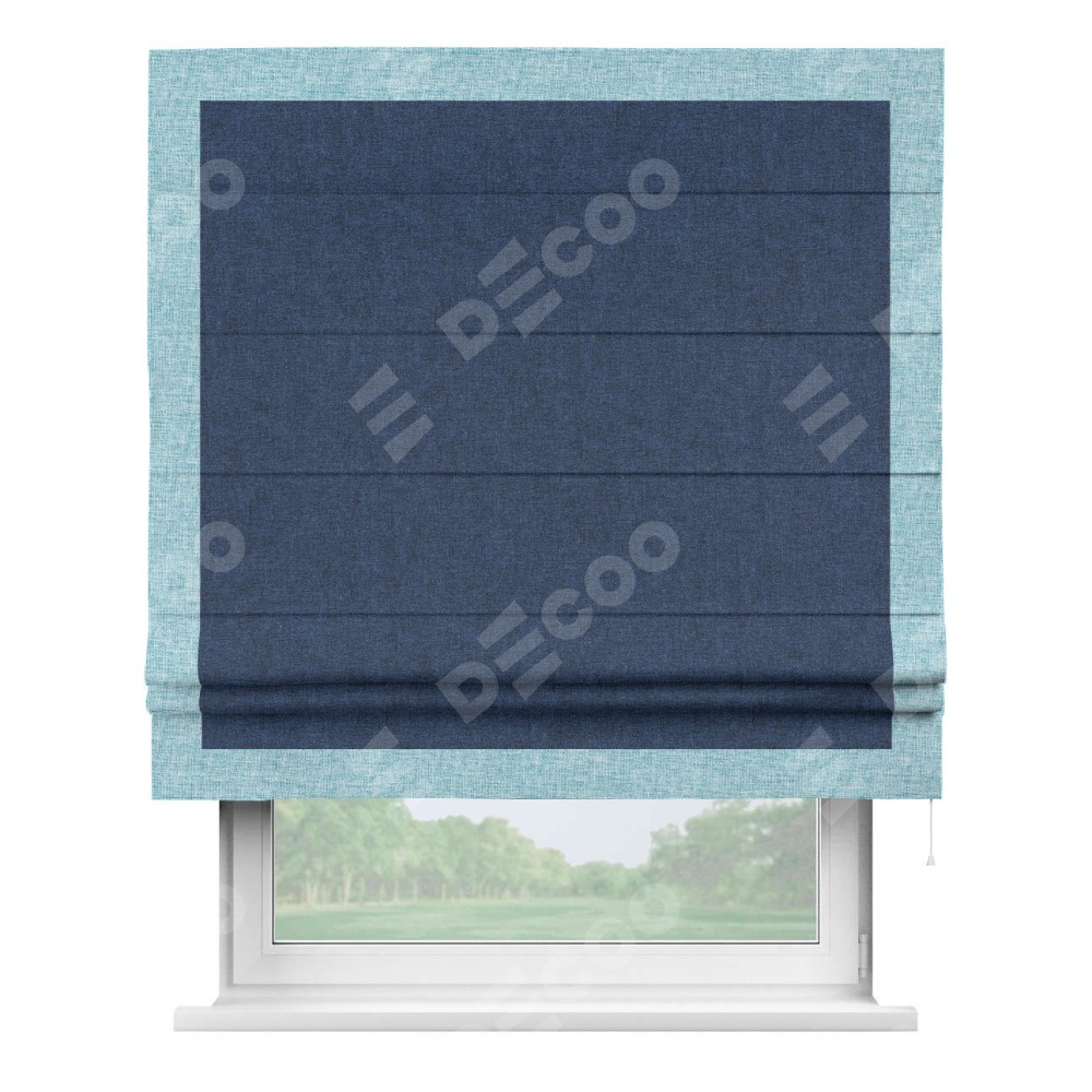 Римская штора пошита из ткани лён кашемир тёмно-синий, артикул: 17215, с отделкой кантом «Чесс» отличается своей уникальной деталью — наличием канта не только по бокам и снизу, но и сверху по всем краям шторы. Это придает шторе особенно аккуратный и завершенный вид, делая акцент на границах и форме шторы. Отделка кантом по всему периметру шторы усиливает её декоративные качества и подчеркивает строгую геометрию, что может быть особенно актуально для современных и минималистичных интерьеров.