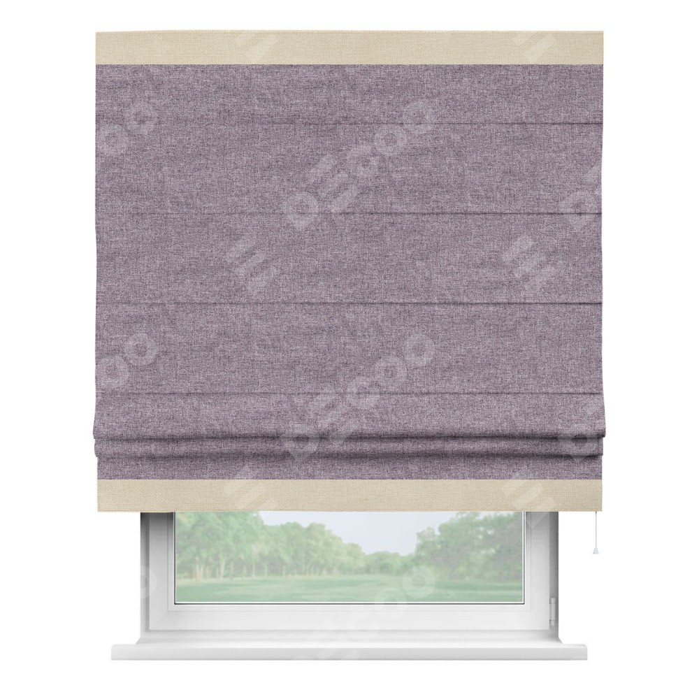 Римская штора пошита из ткани лён кашемир фиолетовый, артикул: 17211, с отделкой кантом «Горизонт» предлагает уникальное дизайнерское решение, при котором кант располагается только вверху и снизу шторы. Такое решение делает акцент на горизонтальных линиях, визуально расширяя пространство и придавая окну более строгий и организованный вид. Отделка кантом в этих ключевых местах не только украшает штору, но и способствует её долговечности, защищая наиболее уязвимые к износу края.