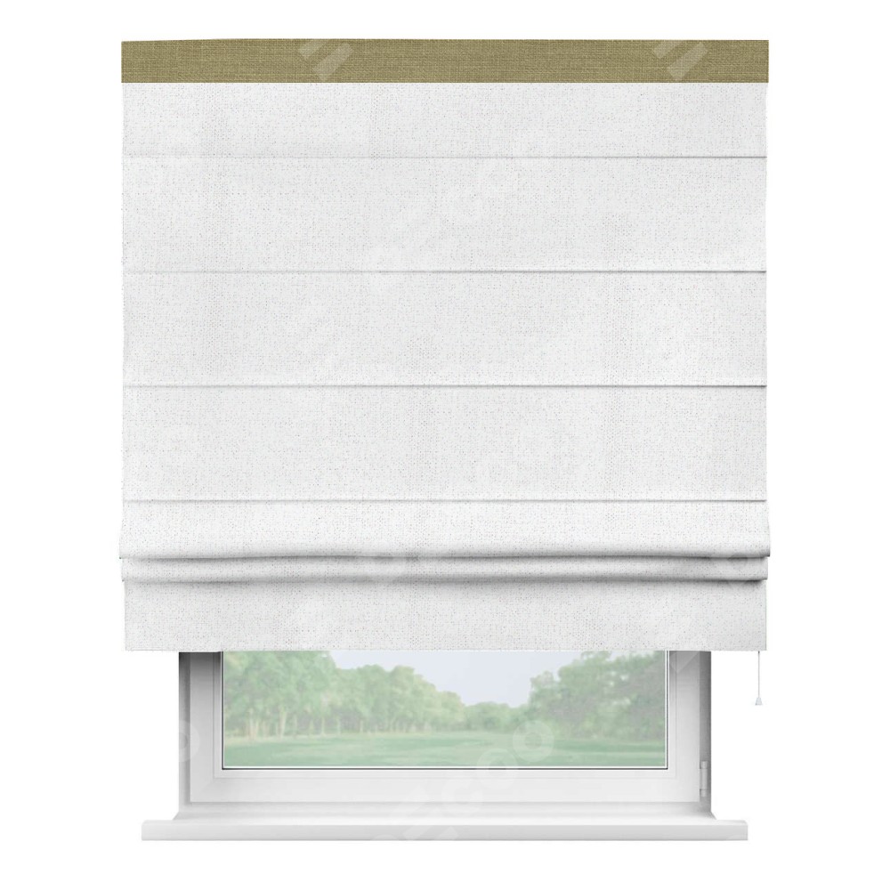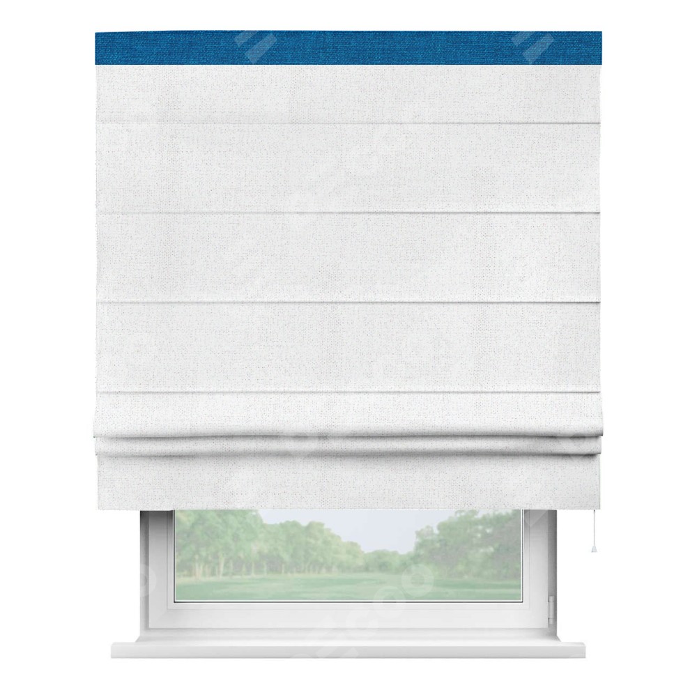 Римская штора пошита из ткани лён белоснежный, артикул: 95632, с отделкой кантом «Кинг» отличается своей необычной особенностью: кант располагается исключительно сверху шторы. Такой дизайн делает акцент на верхней части окна, визуально поднимая потолок и придавая интерьеру более возвышенный и изысканный вид. Отделка кантом на верхней кромке не только украшает штору, но и может служить дополнительной защитой от износа в месте наибольшего контакта с механизмом управления шторой.