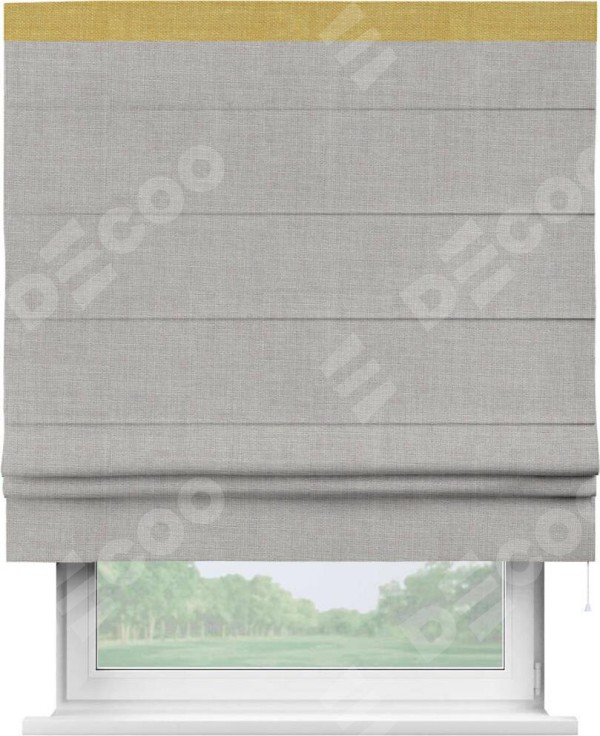 Римская штора пошита из ткани лён серый, артикул: 91410, с отделкой кантом «Кинг» отличается своей необычной особенностью: кант располагается исключительно сверху шторы. Такой дизайн делает акцент на верхней части окна, визуально поднимая потолок и придавая интерьеру более возвышенный и изысканный вид. Отделка кантом на верхней кромке не только украшает штору, но и может служить дополнительной защитой от износа в месте наибольшего контакта с механизмом управления шторой.