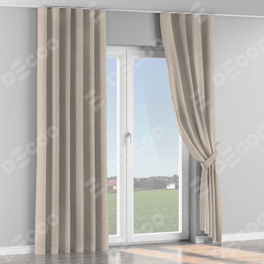 Комплект прямых штор, от производителя «Cortin», пошиты из ткани лён кашемир натуральный беж. С изнаночной стороны в верхней части штор пристрачивается шторная лента с декоративными складками «Волна». Для создания элегантных складок рекомендуемый коэффициент 1:2 (на 100 см. ширины проёма 200 см. ширины ткани). Важно! Ширина штор указана без учёта коэффициента сборки!