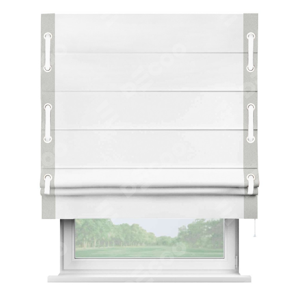 Римская штора «Кортин» для проёма, вайтаут однотонная белая с кантом Стрим Дуо (люверсы с пояском)