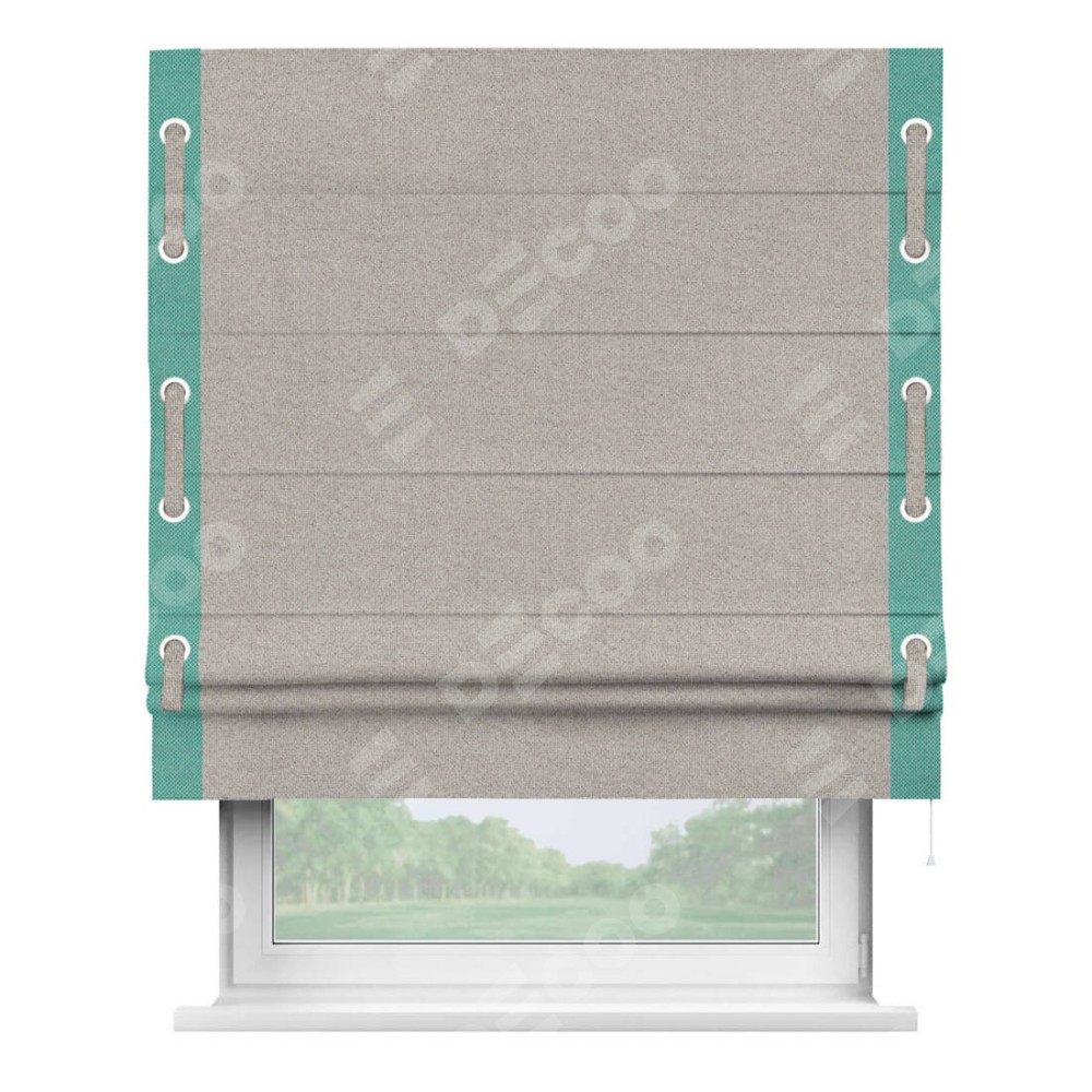 Римская штора «Кортин» для проема, лён димаут серо-бежевый с кантом Стрим Дуо (люверсы с пояском)