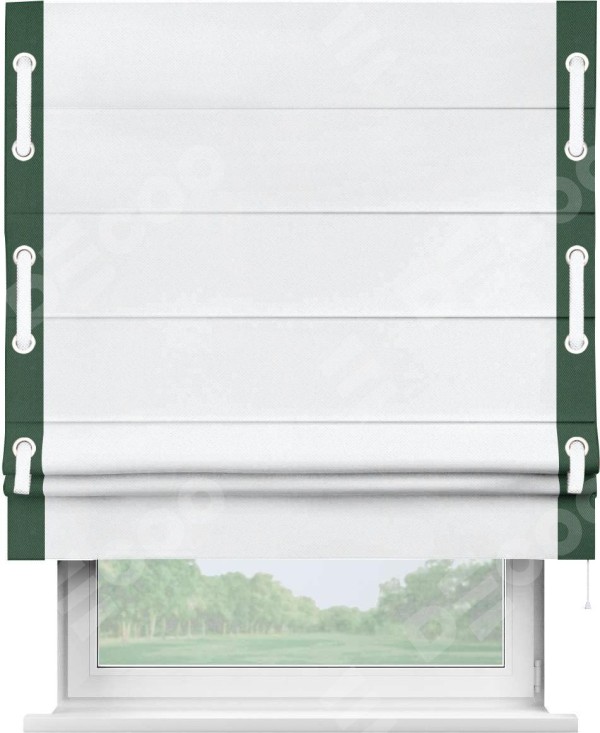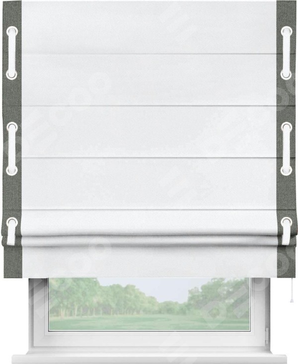 Римская штора «Кортин» для проема, лён димаут белый с кантом Стрим Дуо (люверсы с пояском)